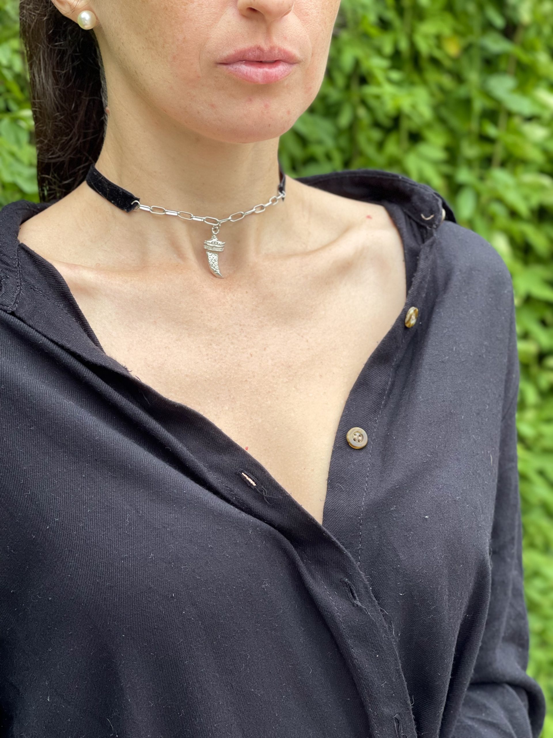 Choker, cordon terciopleo negro y cadenas, dije estrella, con cadena de extension para regular la medida