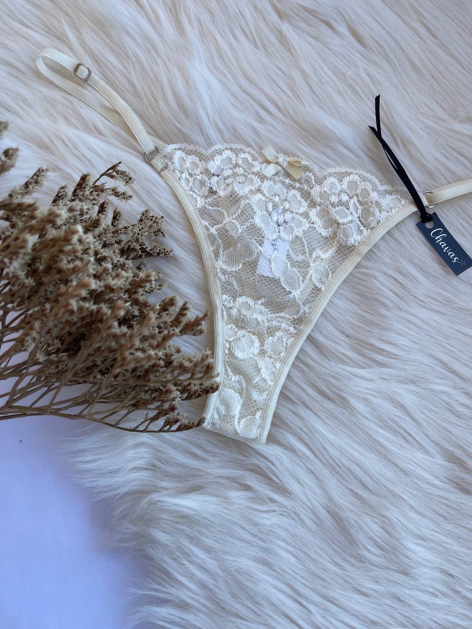 Less en puntilla en color natural, atras de la less es de tela microtul