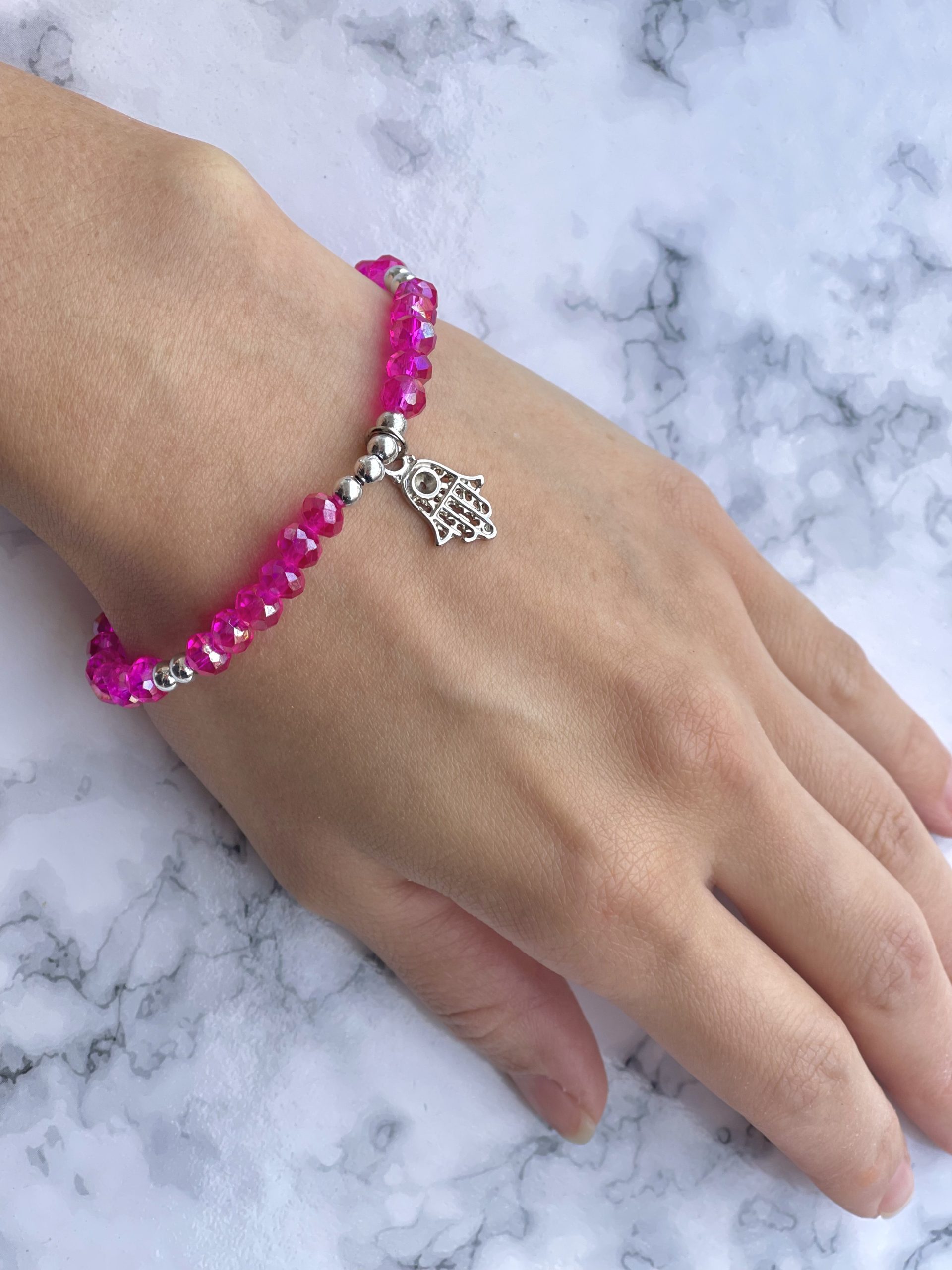 Pulsera cristal fucsia numero 6, dije mano fatima x 1 unidad