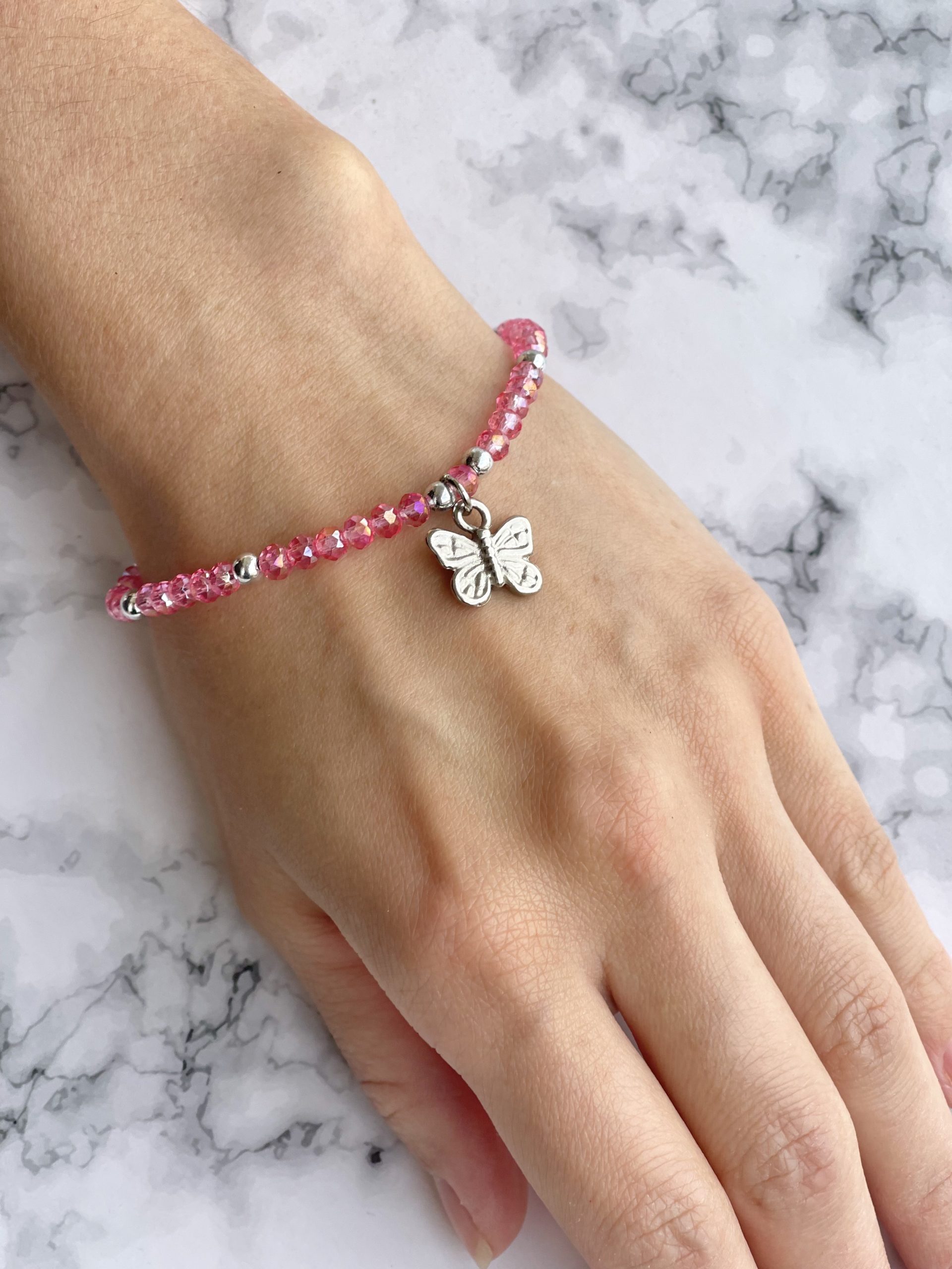 Pulsera cristal rosa mariposa x1 unidad