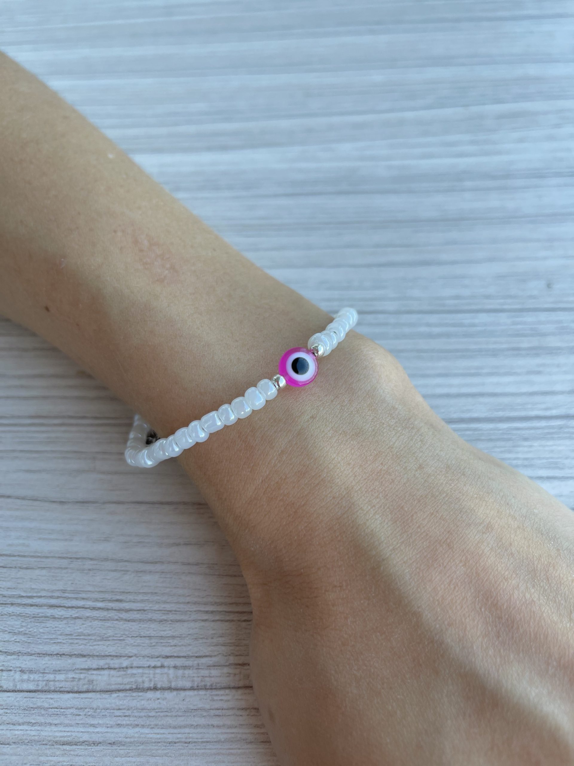 Pulsera para compartir motacillones blanco perlado,ojo turco fucsia ( por un par )